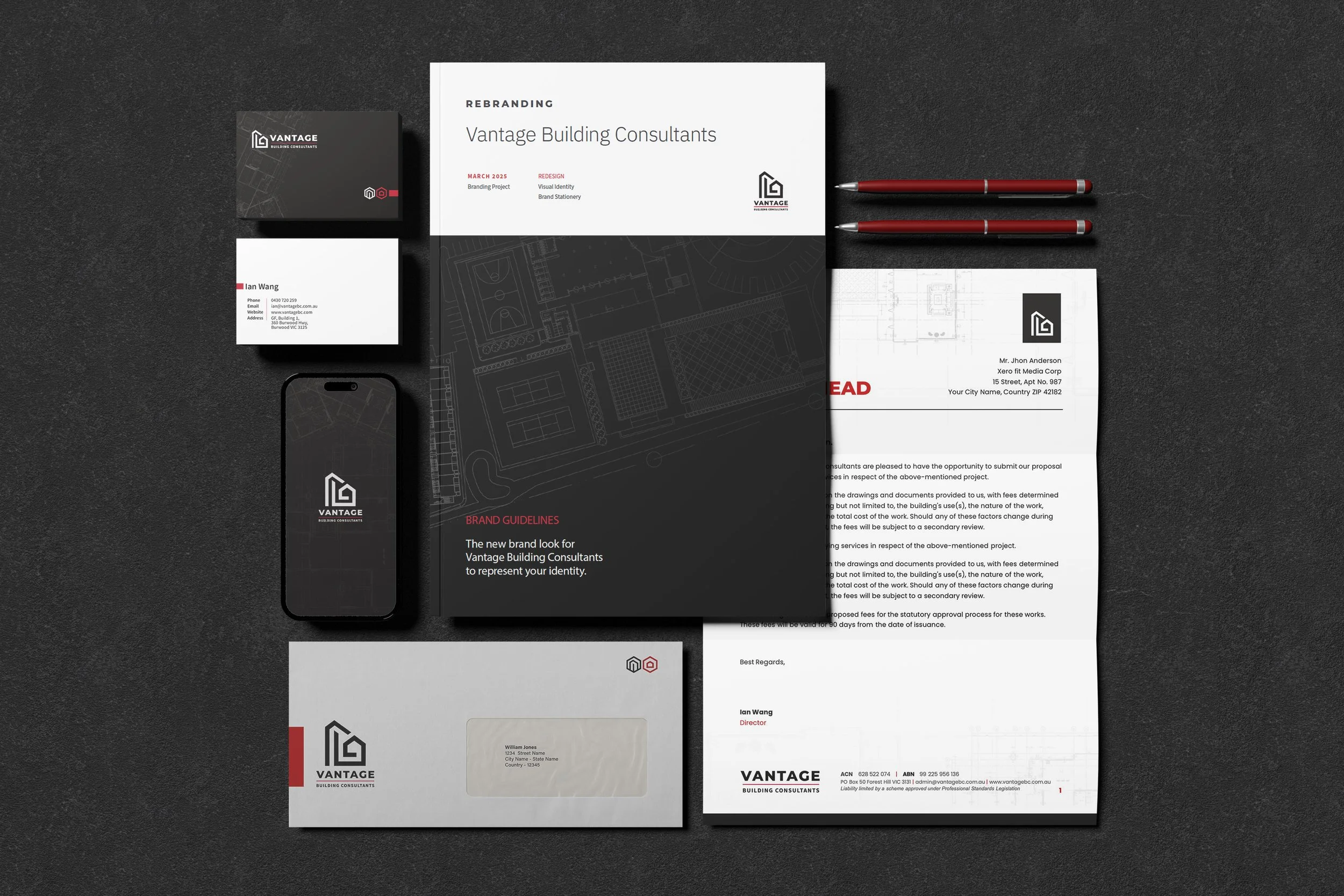 Vantage Building Consultants stands at the intersection of technical expertise and genuine care, guiding clients through the complexities of building permits with clarity and assurance. Our creative philosophy centers on translating this depen-dable partnership into every brand touchpoint, combining professional elegance with approachable demeanor.
